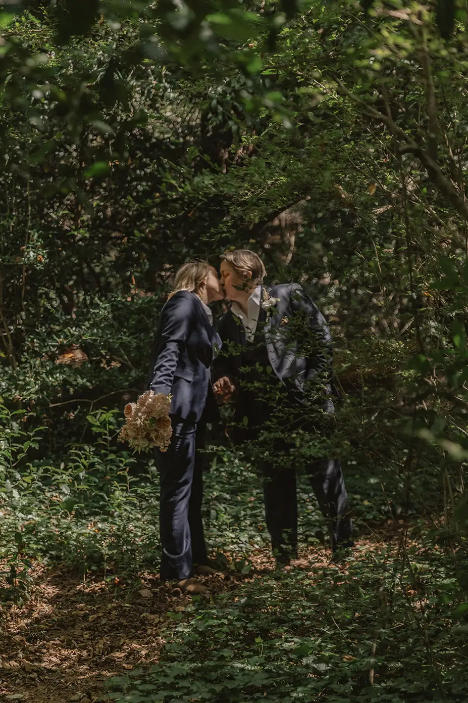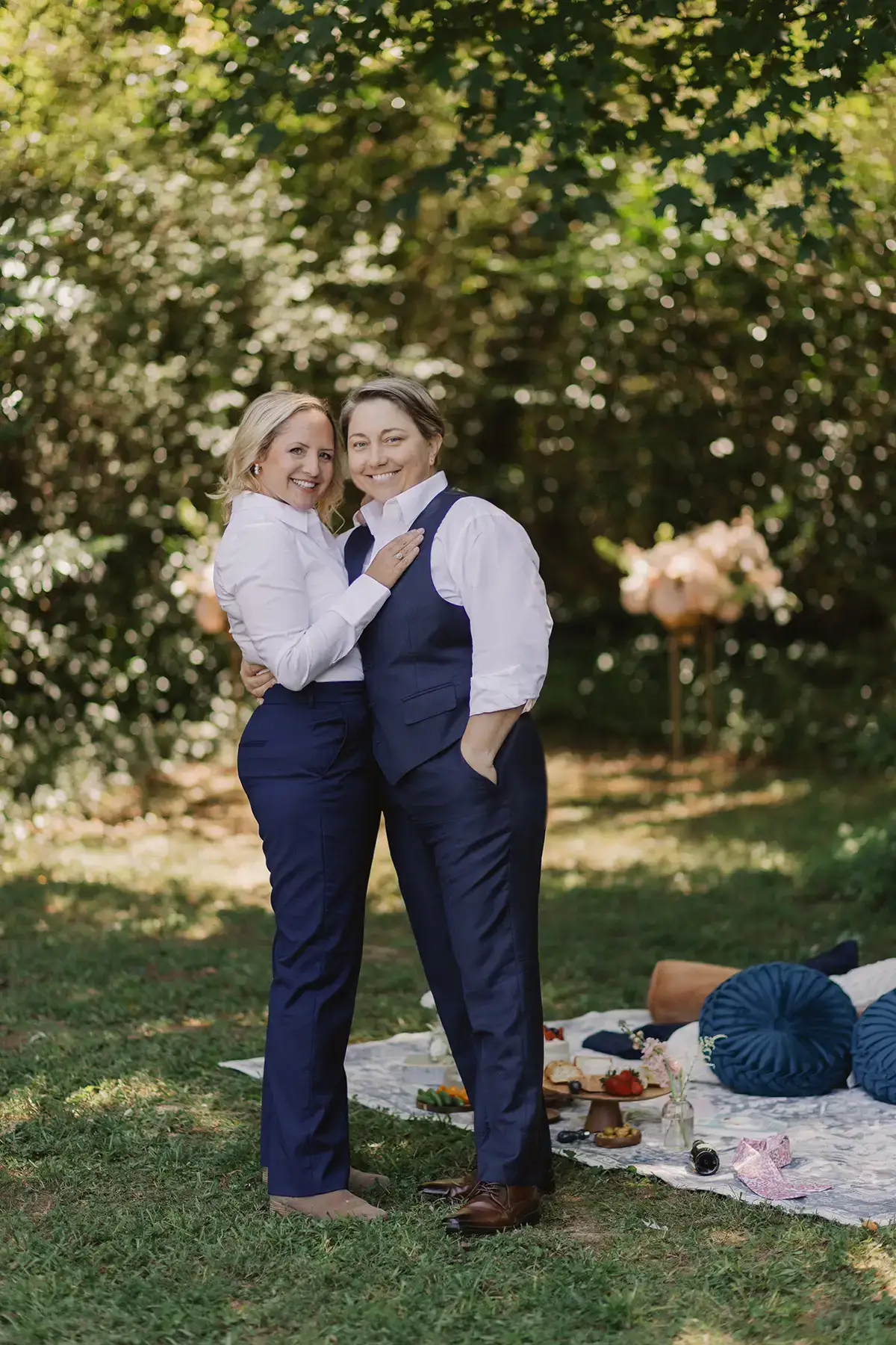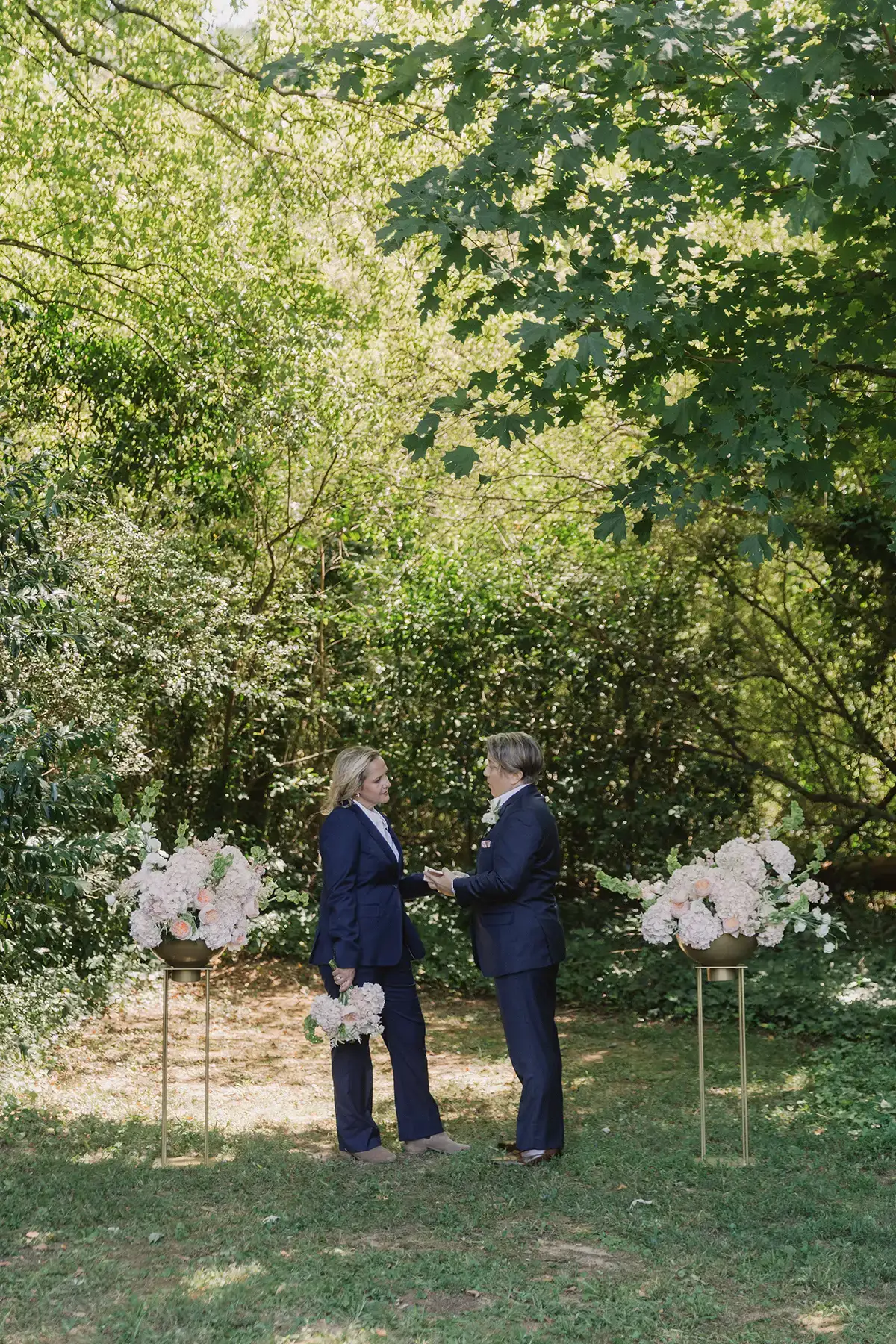 To accomplish this, we created an intimate fall wedding atmosphere on the edge of the woods and called on inclusive LGBTQ+ wedding vendors in Atlanta, where Equally Wed is headquartered. Equally Wed partnered with Amanda Summerlin, a local LGBTQ+ wedding photographer known for her elopement and intimate wedding work for LGBTQ+ couples. Kira Flora, my boutique floral design studio for weddings and events, provided a ceremony installation of pink hydrangeas, garden roses, stock and astilbe to complement the lush wedding bouquet and boutonniere. kylie bowlesthe celebrity hairstylist and makeup artist styled my hair in romantic loose curls and applied a neutral, flattering look to my makeup. Content created by Drei Alquiros, Owner creative panda designfilmed for our social and video content, capturing our playfulness, the love between a long-married queer couple, and the star of the show, Generation Tax.