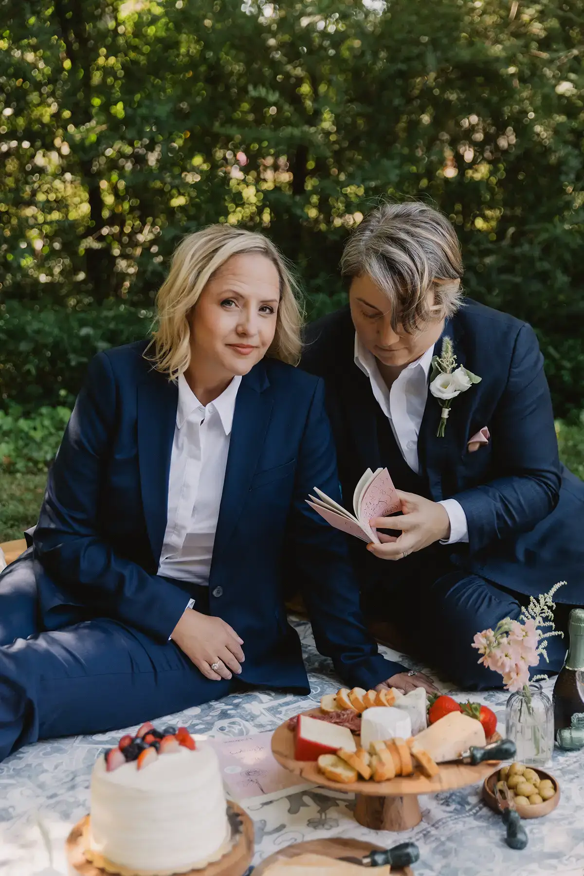 What’s a wedding without a party? Maria and I had a micro wedding reception with a picnic in the woods, complete with a small wedding cake, a bottle of prosecco, floral decorations, and snacks. We then lounged on cushions and read each other’s poems, testing out the comfort and versatility of Tux generation suits. Spoiler alert: They passed! I was able to move smoothly when changing camera angles, and the suit didn’t wrinkle or tug.