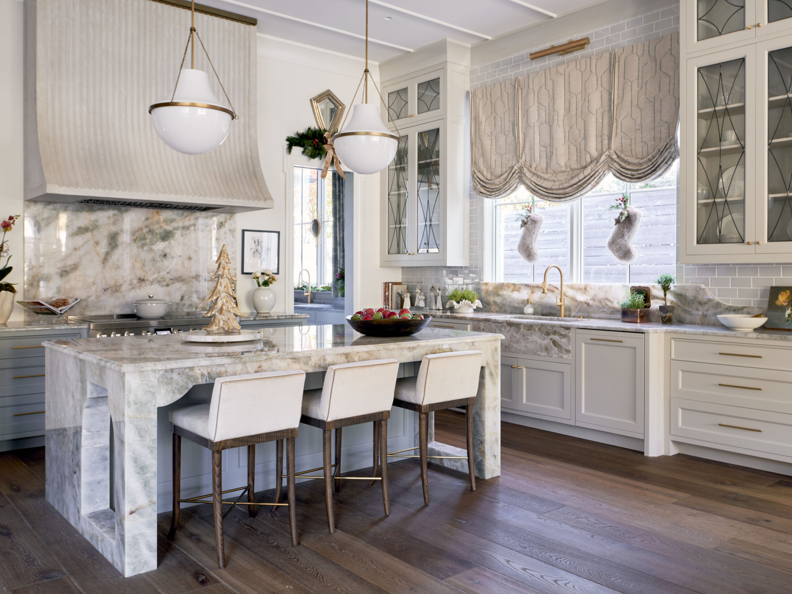 interior, designer Valerie Garrett From the concave vaulted entryway ceiling to the French oak floors and luxurious marble accents, the home is infused with elegance. Art Nouveau influences are evident throughout, including leaded glass kitchen cabinets from Morgan Creek Cabinets, a sculptural fluted marble hood, and sophisticated decorative details.