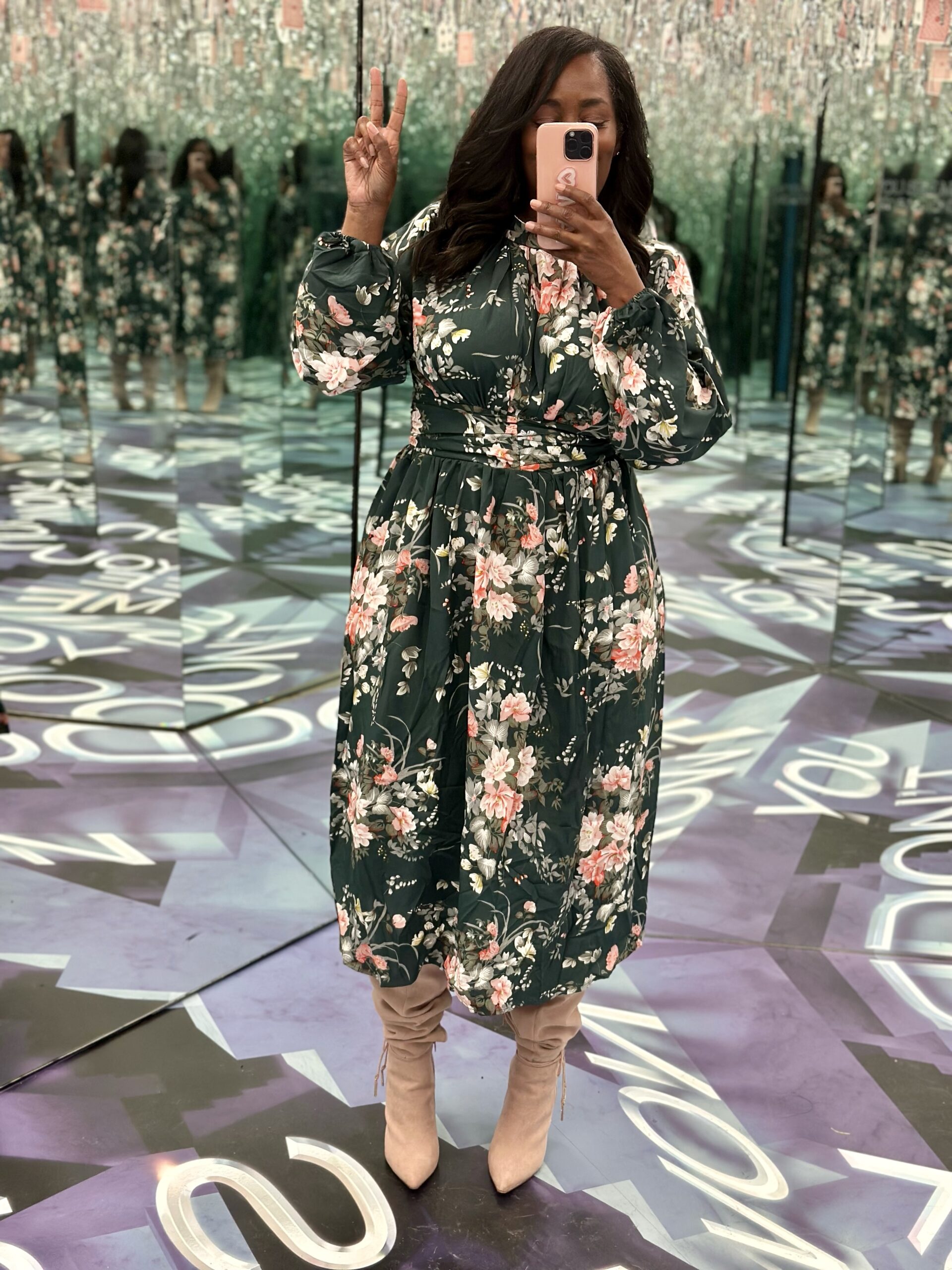 I pulled this cute fall floral dress out of my closet for an event. It has an elegant and cute atmosphere and can be used in a variety of situations. You can wear it to dinner after work, go out for drinks with friends, or like this time, to a movie screening. Pair it with pink suede boots and a matching handbag and you’re ready to go. See inside details and location…