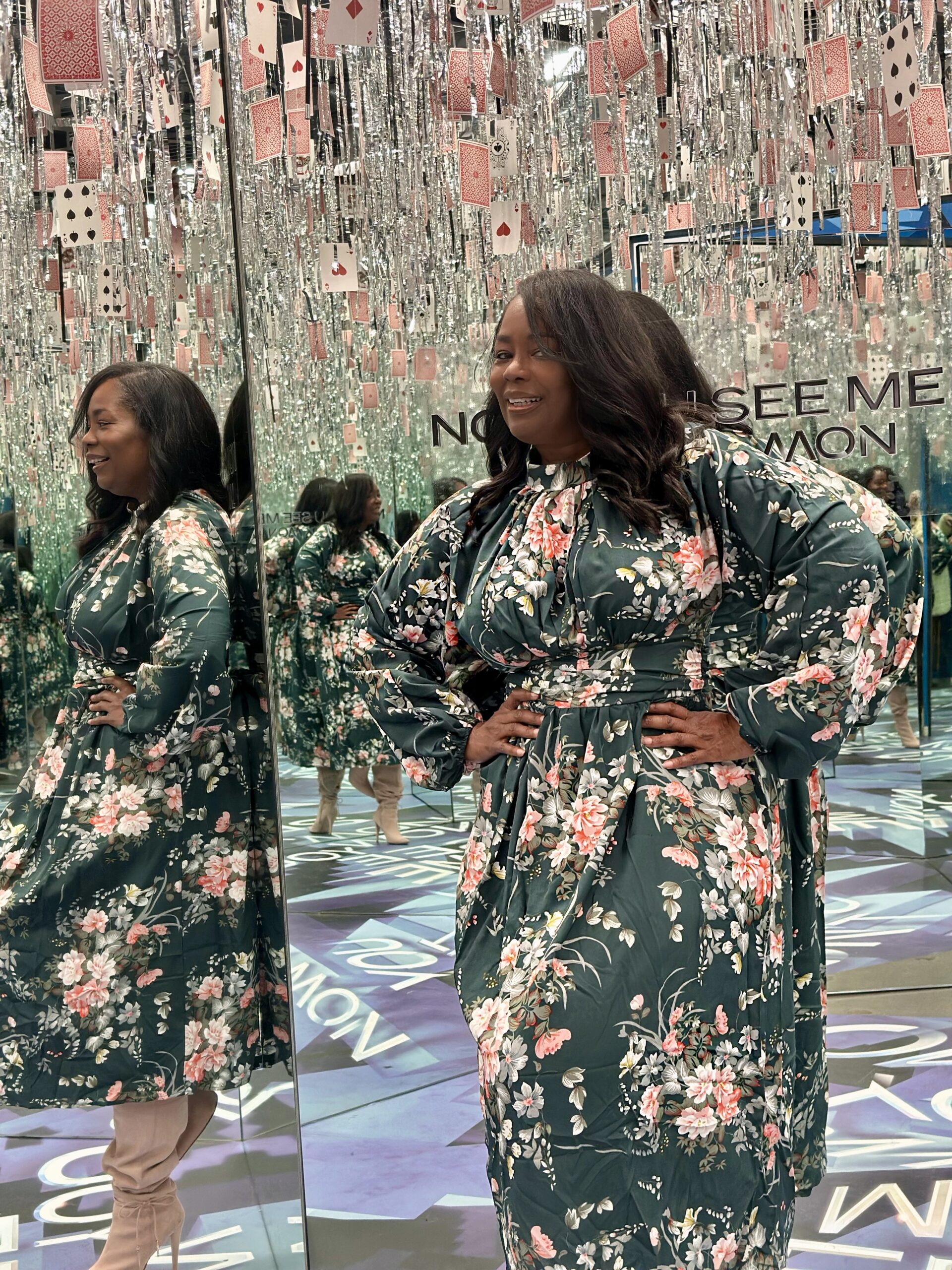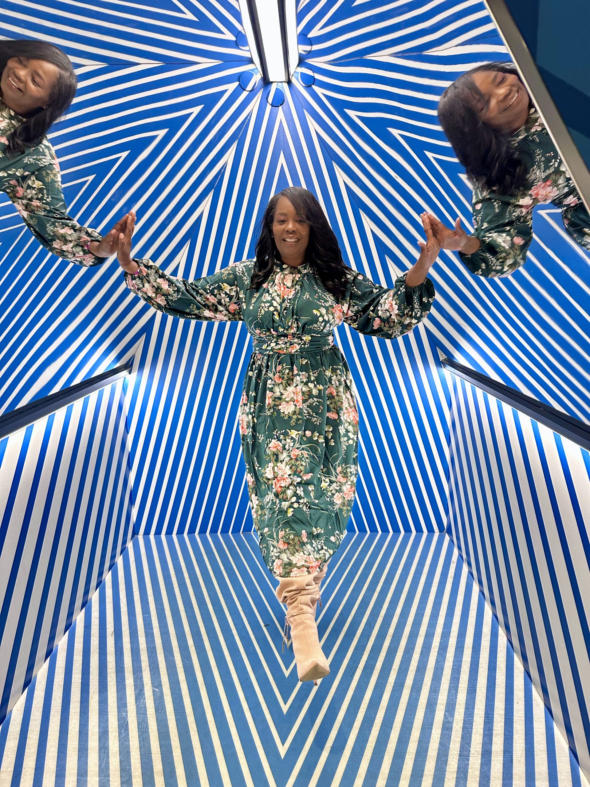 I slipped inside me unique vintage I put on my dress and headed out for a wonderful evening. Before the advance screening of “Now You See Me, Now You Dont.” I stopped by the Museum of Illusions for cocktails, delicious snacks, and of course to take lots of photos. The film will be released in theaters on November 14, 2025, bringing back the original Four Horsemen and a fresh crew of new illusionists. They team up again for another elaborate, high-stakes heist, facing off against a powerful new rival played by Rosamund Pike. Starring Morgan Freeman and directed by Ruben Fleischer. A magical night from start to finish.